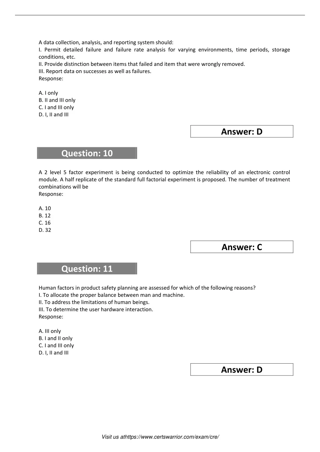 A data collection, analysis, and reporting system should: I. Permit detailed failure and failure rate analysis for varying environments, time periods, storage conditions, etc. II. Provide distinction between items that failed and item that were wrongly removed. III. Report data on successes as well as failures. Response: A. I only B. II and III only C. I and III only D. I, II and III Answer: D Question: 10 A 2 level 5 factor experiment is being conducted to optimize the reliability of an electronic control module. A half replicate of the standard full factorial experiment is proposed. The number of treatment combinations will be Response: A. 10 B. 12 C. 16 D. 32 Answer: C Question: 11 Human factors in product safety planning are assessed for which of the following reasons? I. To allocate the proper balance between man and machine. II. To address the limitations of human beings. III. To determine the user hardware interaction. Response: A. III only B. I and II only C. I and III only D. I, II and III Answer: D Visit us athttps://www.certswarrior.com/exam/cre/