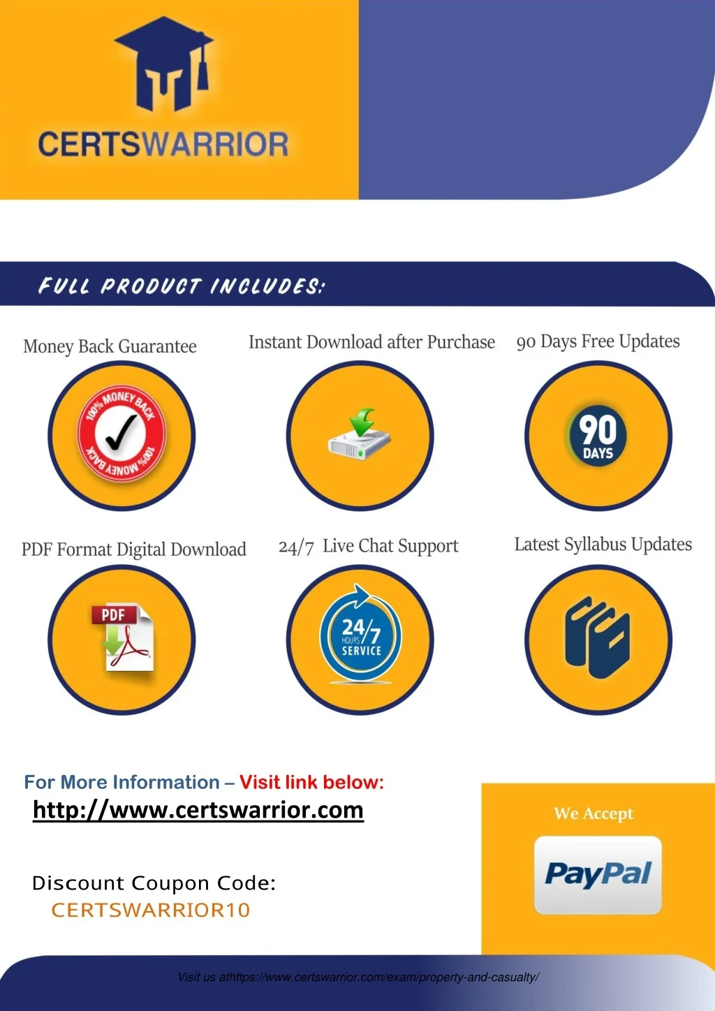 P-and-C Property-and-Casualty Property and Casualty Insurance Questions & Answers PDF For More Information: https://www.certswarrior.com/ Features: 90 Days Free Updates 30 Days Money Back Guarantee Instant Download Once Purchased 24/7 Online Chat Support Its Latest Version Visit us athttps://www.certswarrior.com/exam/property-and-casualty/