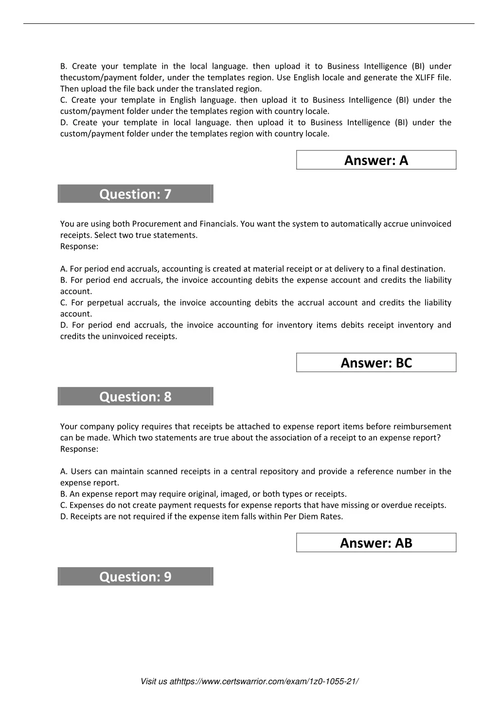 B. Create your template in the local language. then upload it to Business Intelligence (BI) under thecustom/payment folder, under the templates region. Use English locale and generate the XLIFF file. Then upload the file back under the translated region. C. Create your template in English language. then upload it to Business Intelligence (BI) under the custom/payment folder under the templates region with country locale. D. Create your template in local language. then upload it to Business Intelligence (BI) under the custom/payment folder under the templates region with country locale. Answer: A Question: 7 You are using both Procurement and Financials. You want the system to automatically accrue uninvoiced receipts. Select two true statements. Response: A. For period end accruals, accounting is created at material receipt or at delivery to a final destination. B. For period end accruals, the invoice accounting debits the expense account and credits the liability account. C. For perpetual accruals, the invoice accounting debits the accrual account and credits the liability account. D. For period end accruals, the invoice accounting for inventory items debits receipt inventory and credits the uninvoiced receipts. Answer: BC Question: 8 Your company policy requires that receipts be attached to expense report items before reimbursement can be made. Which two statements are true about the association of a receipt to an expense report? Response: A. Users can maintain scanned receipts in a central repository and provide a reference number in the expense report. B. An expense report may require original, imaged, or both types or receipts. C. Expenses do not create payment requests for expense reports that have missing or overdue receipts. D. Receipts are not required if the expense item falls within Per Diem Rates. Answer: AB Question: 9 Visit us athttps://www.certswarrior.com/exam/1z0-1055-21/