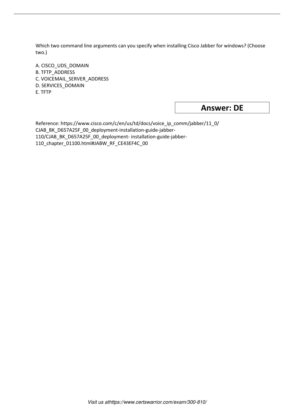 Which two command line arguments can you specify when installing Cisco Jabber for windows? (Choose two.) A. CISCO_UDS_DOMAIN B. TFTP_ADDRESS C. VOICEMAIL_SERVER_ADDRESS D. SERVICES_DOMAIN E. TFTP Answer: DE Reference: https://www.cisco.com/c/en/us/td/docs/voice_ip_comm/jabber/11_0/ CJAB_BK_D657A25F_00_deployment-installation-guide-jabber- 110/CJAB_BK_D657A25F_00_deployment- installation-guide-jabber- 110_chapter_01100.html#JABW_RF_CE43EF4C_00 Visit us athttps://www.certswarrior.com/exam/300-810/