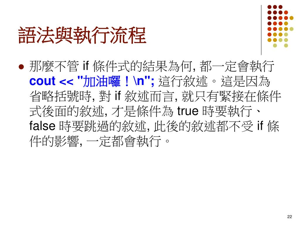 語法與執行流程 • 那麼不管 if 條件式的結果為何, 都一定會執行 cout << "加油囉!\n"; 這行敘述。這是因為省略括號時, 對 if 敘述而言, 就只有緊接在條件式後面的敘述, 才是條件為 true 時要執行、false 時要跳過的敘述, 此後的敘述都不受 if 條件的影響, 一定都會執行。