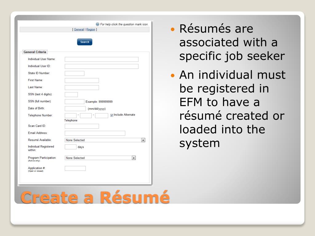 Résumés are associated with a specific job seeker • An individual must be registered in EFM to have a résumé created or loaded into the system Create a Résumé