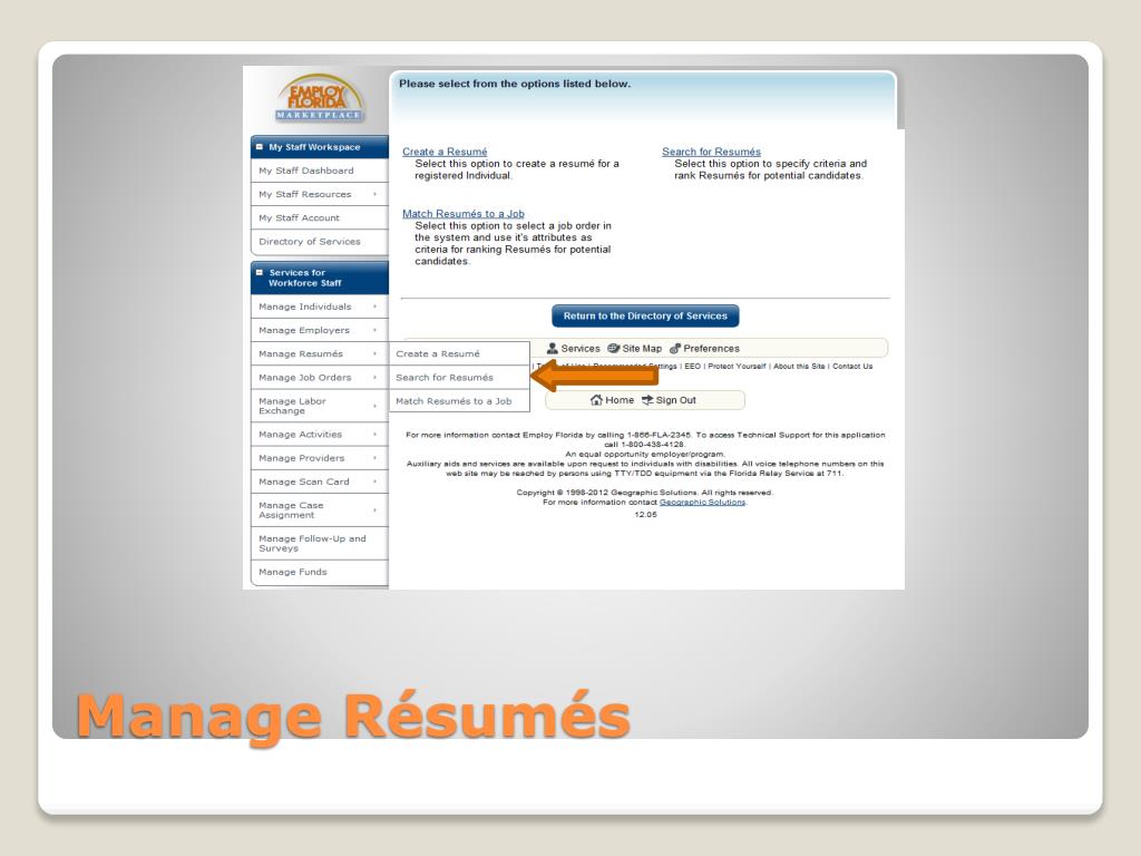 State of Florida’s online job service website • Provides information and data exchange for job seekers and employers • Job seekers • Look for work using EFM • If registered, can create and post résumés directly in the system and apply for jobs through EFM What is EFM?
