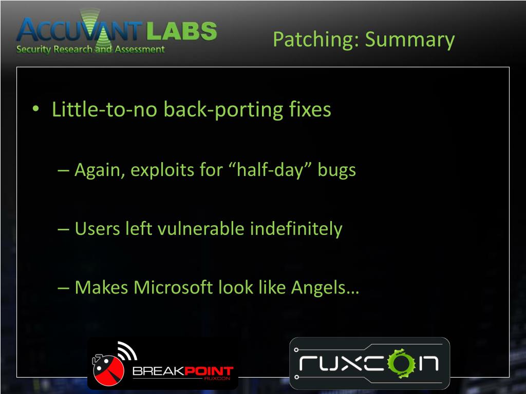 Patching: Summary • Little-to-no back-porting fixes • Again, exploits for “half-day” bugs • Users left vulnerable indefinitely • Makes Microsoft look like Angels…