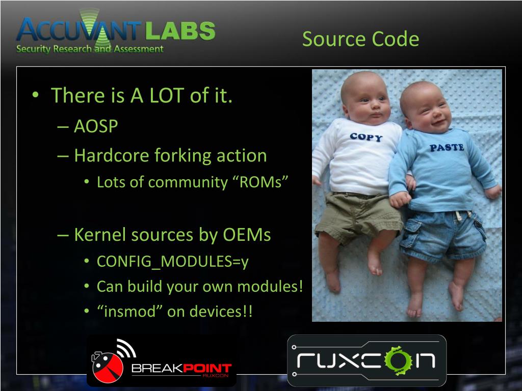 Source Code • There is A LOT of it. • AOSP • Hardcore forking action • Lots of community “ROMs” • Kernel sources by OEMs • CONFIG_MODULES=y • Can build your own modules! • “insmod” on devices!!