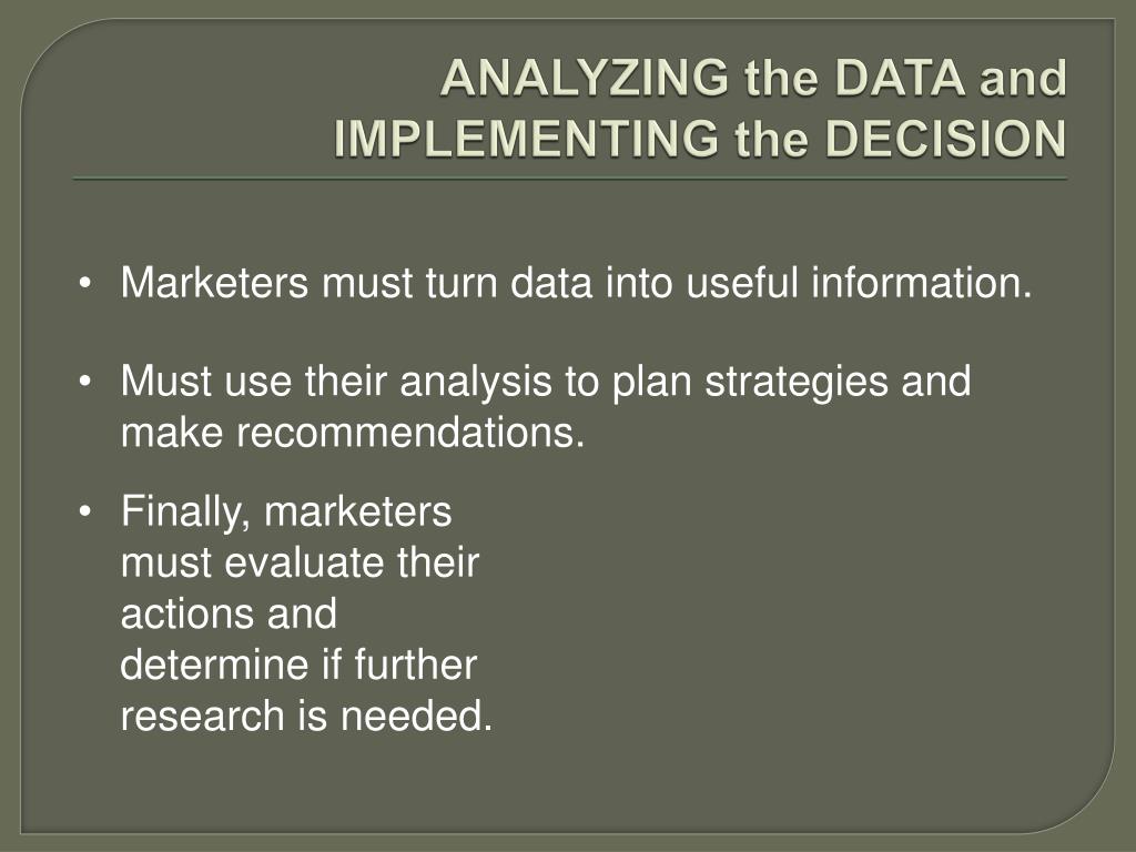 ANALYZING the DATA and IMPLEMENTING the DECISION • Marketers must turn data into useful information. • Must use their analysis to plan strategies and make recommendations. • Finally, marketers must evaluate their actions and determine if further research is needed.