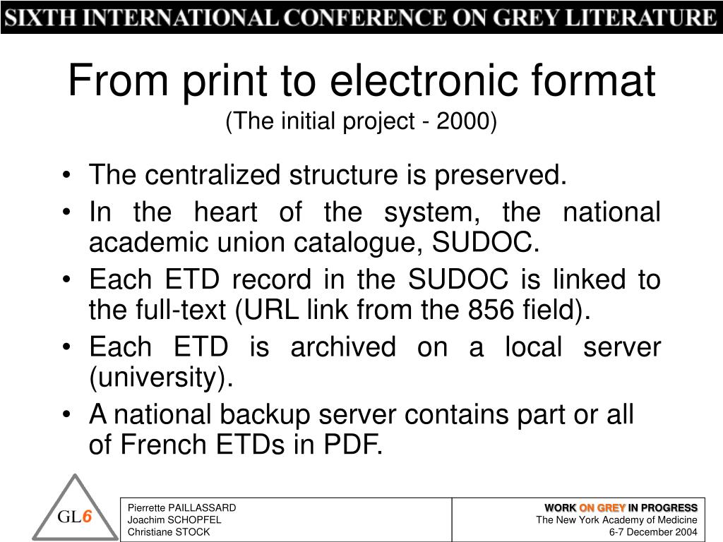From print to electronic format(The initial project - 2000) • The centralized structure is preserved. • In the heart of the system, the national academic union catalogue, SUDOC. • Each ETD record in the SUDOC is linked to the full-text (URL link from the 856 field). • Each ETD is archived on a local server (university). • A national backup server contains part or all of French ETDs in PDF. Pierrette PAILLASSARD Joachim SCHOPFEL Christiane STOCK WORK ON GREY IN PROGRESS The New York Academy of Medicine 6-7 December 2004