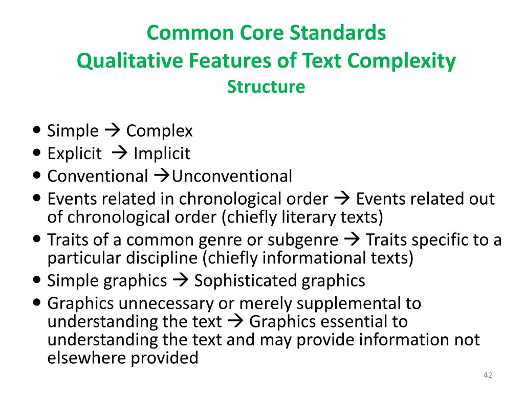 Common Core StandardsQualitative Features of Text ComplexityStructure • Simple Complex • Explicit Implicit • Conventional Unconventional • Events related in chronological order Events related out of chronological order (chiefly literary texts) • Traits of a common genre or subgenre Traits specific to a particular discipline (chiefly informational texts) • Simple graphics Sophisticated graphics • Graphics unnecessary or merely supplemental to understanding the text Graphics essential to understanding the text and may provide information not elsewhere provided