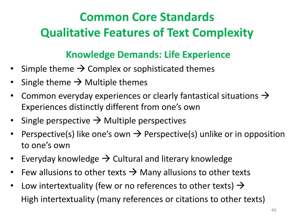Common Core StandardsQualitative Features of Text Complexity Knowledge Demands: Life Experience • Simple theme Complex or sophisticated themes • Single theme Multiple themes • Common everyday experiences or clearly fantastical situations Experiences distinctly different from one’s own • Single perspective Multiple perspectives • Perspective(s) like one’s own Perspective(s) unlike or in opposition to one’s own • Everyday knowledge Cultural and literary knowledge • Few allusions to other texts Many allusions to other texts • Low intertextuality (few or no references to other texts) High intertextuality (many references or citations to other texts)