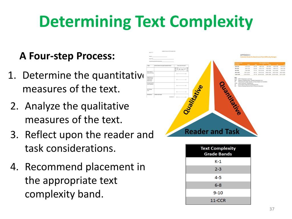 Determining Text Complexity A Four-step Process: Determine the quantitative measures of the text. Quantitative Qualitative Analyze the qualitative measures of the text. Reader and Task Reflect upon the reader and task considerations. Recommend placement in the appropriate text complexity band.
