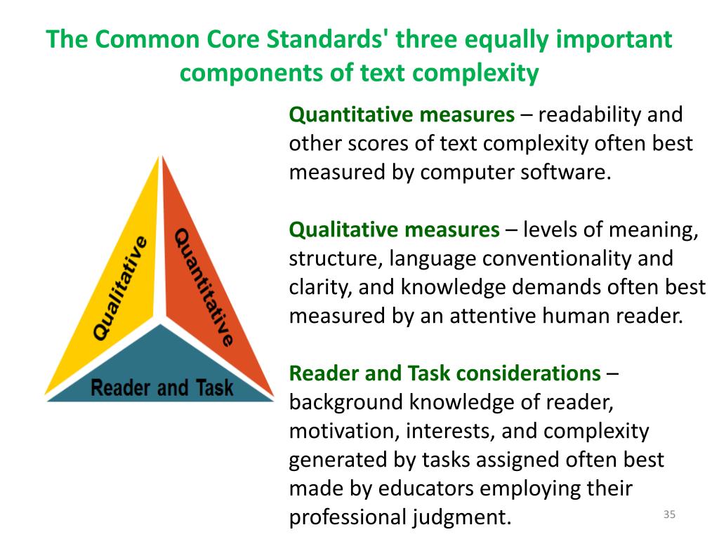 The Common Core Standards' three equally important components of text complexity Quantitative measures – readability and other scores of text complexity often best measured by computer software. Qualitative measures – levels of meaning, structure, language conventionality and clarity, and knowledge demands often best measured by an attentive human reader. Reader and Task considerations – background knowledge of reader, motivation, interests, and complexity generated by tasks assigned often best made by educators employing their professional judgment.