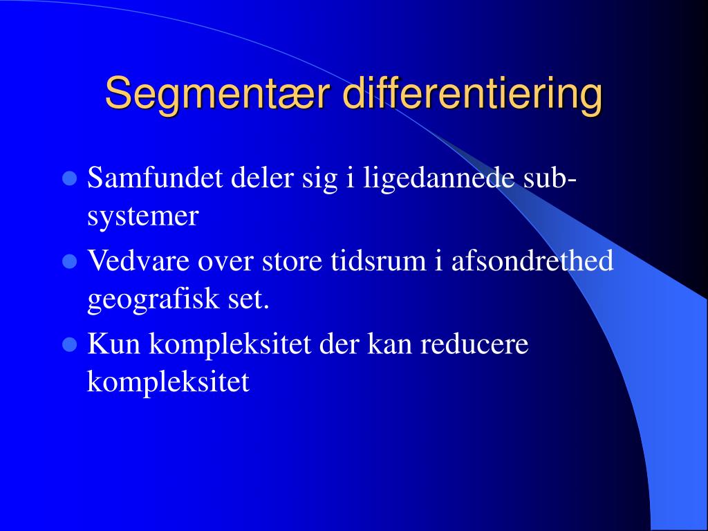 Segmentær differentiering • Samfundet deler sig i ligedannede sub-systemer • Vedvare over store tidsrum i afsondrethed geografisk set. • Kun kompleksitet der kan reducere kompleksitet
