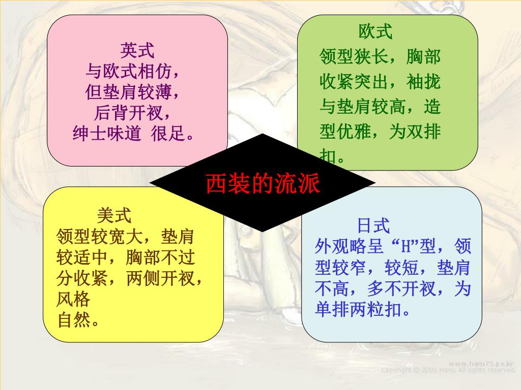 英式 与欧式相仿, 但垫肩较薄, 后背开衩, 绅士味道 很足。 欧式 领型狭长,胸部 收紧突出,袖拢 与垫肩较高,造 型优雅,为双排 扣。 西装的流派 美式 领型较宽大,垫肩 较适中,胸部不过 分收紧,两侧开衩, 风格 自然。 日式 外观略呈“H”型,领 型较窄,较短,垫肩 不高,多不开衩,为 单排两粒扣。