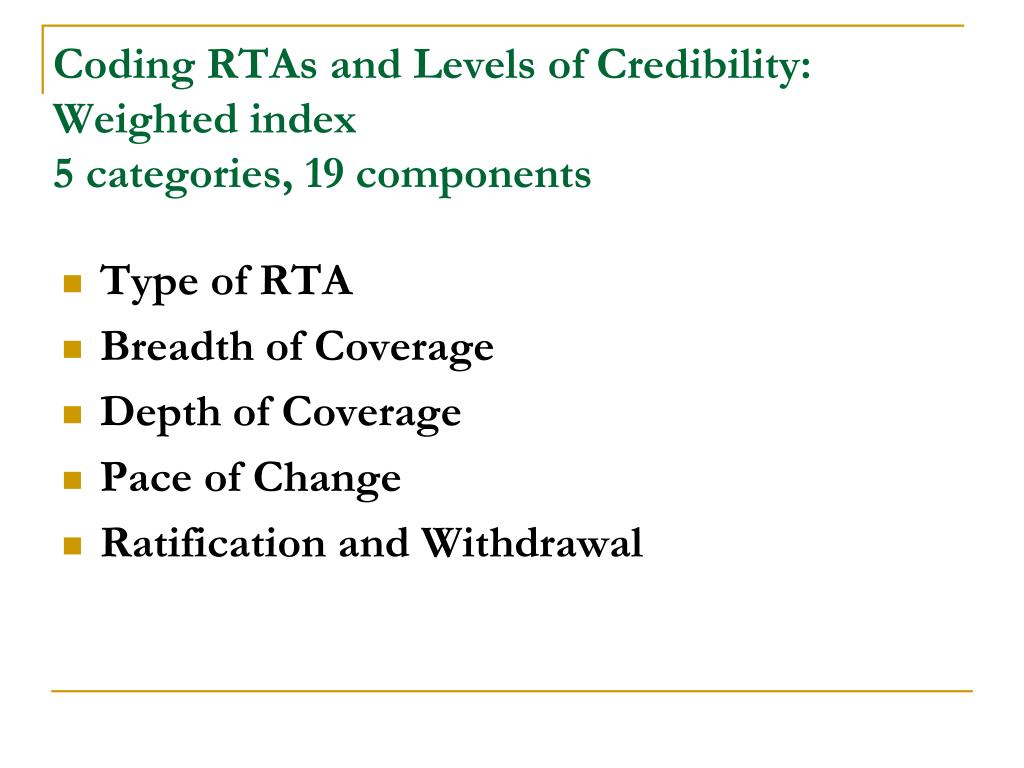 Coding RTAs and Levels of Credibility:Weighted index 5 categories, 19 components • Type of RTA • Breadth of Coverage • Depth of Coverage • Pace of Change • Ratification and Withdrawal