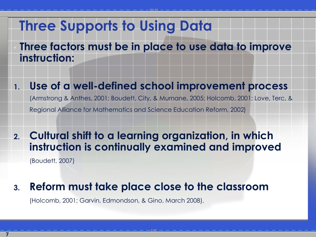 Three Supports to Using Data • Three factors must be in place to use data to improve instruction: • Use of a well-defined school improvement process (Armstrong & Anthes, 2001; Boudett, City, & Murnane, 2005; Holcomb, 2001; Love, Terc, & Regional Alliance for Mathematics and Science Education Reform, 2002) • Cultural shift to a learning organization, in which instruction is continually examined and improved • (Boudett, 2007) • Reform must take place close to the classroom • (Holcomb, 2001; Garvin, Edmondson, & Gino, March 2008).