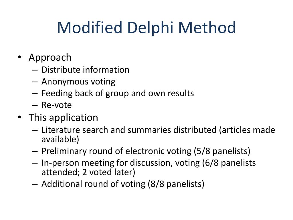 Modified Delphi Method • Approach • Distribute information • Anonymous voting • Feeding back of group and own results • Re-vote • This application • Literature search and summaries distributed (articles made available) • Preliminary round of electronic voting (5/8 panelists) • In-person meeting for discussion, voting (6/8 panelists attended; 2 voted later) • Additional round of voting (8/8 panelists)