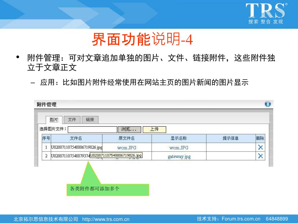 界面功能说明-4 • 附件管理:可对文章追加单独的图片、文件、链接附件,这些附件独立于文章正文 • 应用:比如图片附件经常使用在网站主页的图片新闻的图片显示 各类附件都可添加多个