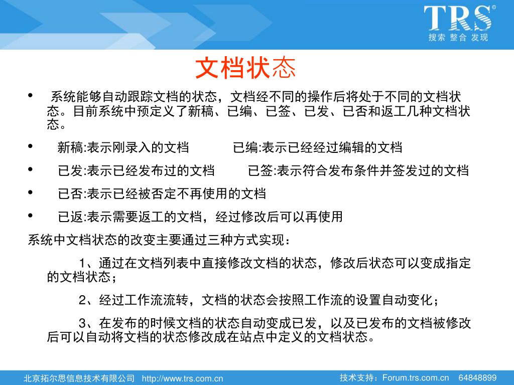 文档状态 • 系统能够自动跟踪文档的状态,文档经不同的操作后将处于不同的文档状态。目前系统中预定义了新稿、已编、已签、已发、已否和返工几种文档状态。 • 新稿:表示刚录入的文档 已编:表示已经经过编辑的文档 • 已发:表示已经发布过的文档 已签:表示符合发布条件并签发过的文档 • 已否:表示已经被否定不再使用的文档 • 已返:表示需要返工的文档,经过修改后可以再使用 系统中文档状态的改变主要通过三种方式实现: 1、通过在文档列表中直接修改文档的状态,修改后状态可以变成指定的文档状态; 2、经过工作流流转,文档的状态会按照工作流的设置自动变化; 3、在发布的时候文档的状态自动变成已发,以及已发布的文档被修改后可以自动将文档的状态修改成在站点中定义的文档状态。