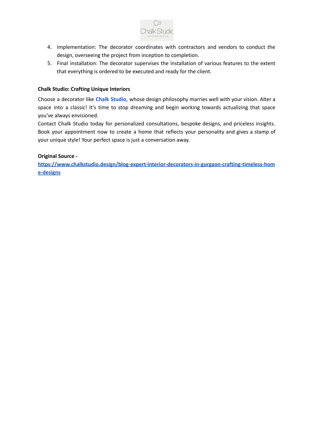 4.Implementation: The decorator coordinates with contractors and vendors to conduct the design, overseeing the project from inception to completion. 5.Final installation: The decorator supervises the installation of various features to the extent that everything is ordered to be executed and ready for the client. Chalk Studio: Crafting Unique Interiors Choose a decorator like Chalk Studio, whose design philosophy marries well with your vision. Alter a space into a classic! It's time to stop dreaming and begin working towards actualizing that space you've always envisioned. Contact Chalk Studio today for personalized consultations, bespoke designs, and priceless insights. Book your appointment now to create a home that reflects your personality and gives a stamp of your unique style! Your perfect space is just a conversation away. Original Source - https://www.chalkstudio.design/blog-expert-interior-decorators-in-gurgaon-crafting-timeless-hom e-designs