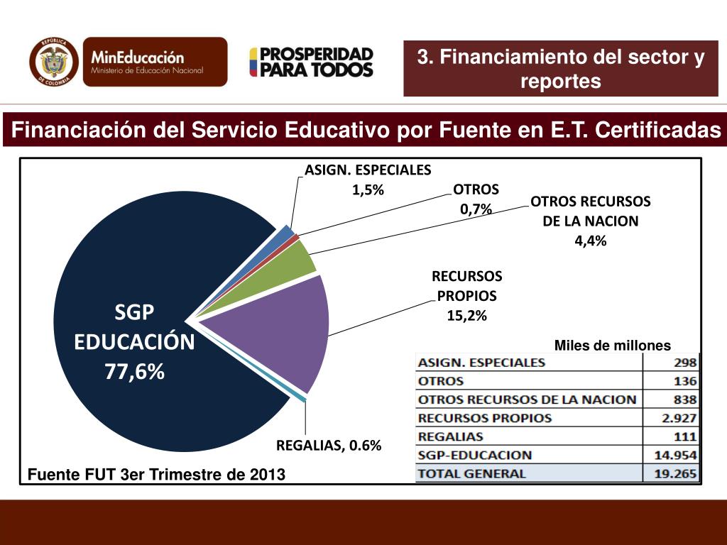 3. Financiamiento del sector y reportes Financiación Global del Servicio Educativo por Fuente Miles de millones Fuente FUT 3er Trimestre de 2013