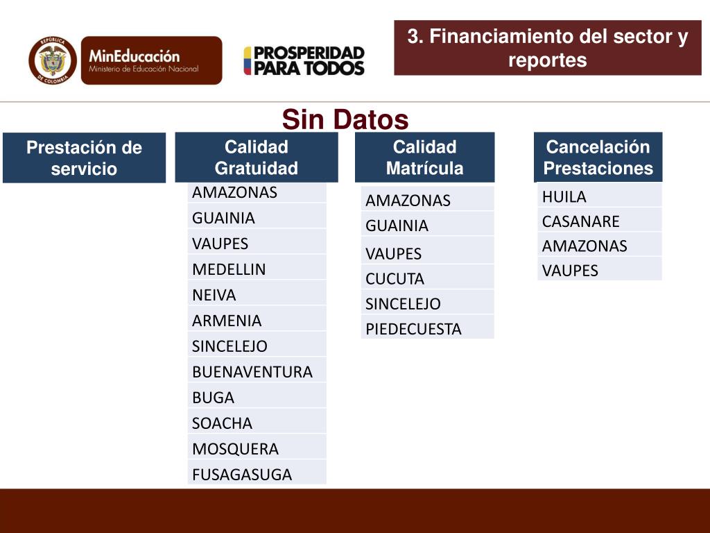 3. Financiamiento del sector y reportes Sin Datos Calidad Gratuidad Calidad Matrícula Cancelación Prestaciones Prestación de servicio