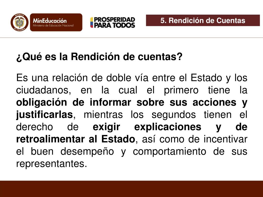 5. Rendición de Cuentas ¿Qué es la Rendición de cuentas? Es una relación de doble vía entre el Estado y los ciudadanos, en la cual el primero tiene la obligación de informar sobre sus acciones y justificarlas, mientras los segundos tienen el derecho de exigir explicaciones y de retroalimentar al Estado, así como de incentivar el buen desempeño y comportamiento de sus representantes.