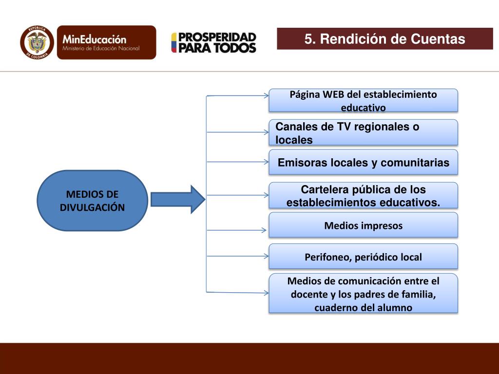 5. Rendición de Cuentas Página WEB del establecimiento educativo Canales de TV regionales o locales Emisoras locales y comunitarias MEDIOS DE DIVULGACIÓN Cartelera pública de los establecimientos educativos. Medios impresos Perifoneo, periódico local Medios de comunicación entre el docente y los padres de familia, cuaderno del alumno