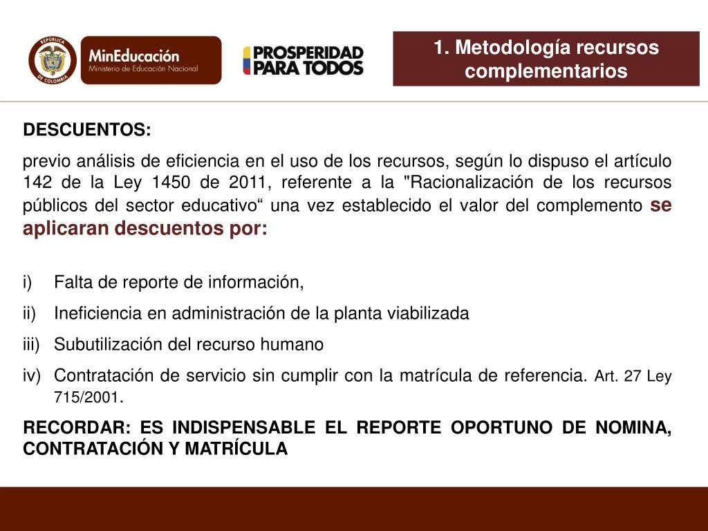 1. Metodología recursos complementarios • DESCUENTOS: • previo análisis de eficiencia en el uso de los recursos, según lo dispuso el artículo 142 de la Ley 1450 de 2011, referente a la "Racionalización de los recursos públicos del sector educativo“ una vez establecido el valor del complemento se aplicaran descuentos por: • Falta de reporte de información, • Ineficiencia en administración de la planta viabilizada • Subutilización del recurso humano • Contratación de servicio sin cumplir con la matrícula de referencia. Art. 27 Ley 715/2001. • RECORDAR: ES INDISPENSABLE EL REPORTE OPORTUNO DE NOMINA, CONTRATACIÓN Y MATRÍCULA