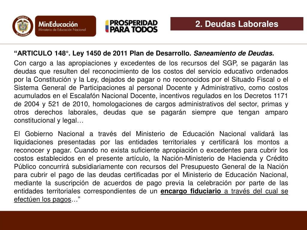 2. Deudas Laborales “ARTICULO 148°. Ley 1450 de 2011 Plan de Desarrollo. Saneamiento de Deudas. Con cargo a las apropiaciones y excedentes de los recursos del SGP, se pagarán las deudas que resulten del reconocimiento de los costos del servicio educativo ordenados por la Constitución y la Ley, dejados de pagar o no reconocidos por el Situado Fiscal o el Sistema General de Participaciones al personal Docente y Administrativo, como costos acumulados en el Escalafón Nacional Docente, incentivos regulados en los Decretos 1171 de 2004 y 521 de 2010, homologaciones de cargos administrativos del sector, primas y otros derechos laborales, deudas que se pagarán siempre que tengan amparo constitucional y legal… El Gobierno Nacional a través del Ministerio de Educación Nacional validará las liquidaciones presentadas por las entidades territoriales y certificará los montos a reconocer y pagar. Cuando no exista suficiente apropiación o excedentes para cubrir los costos establecidos en el presente artículo, la Nación-Ministerio de Hacienda y Crédito Público concurrirá subsidiariamente con recursos del Presupuesto General de la Nación para cubrir el pago de las deudas certificadas por el Ministerio de Educación Nacional, mediante la suscripción de acuerdos de pago previa la celebración por parte de las entidades territoriales correspondientes de un encargo fiduciario a través del cual se efectúen los pagos…”