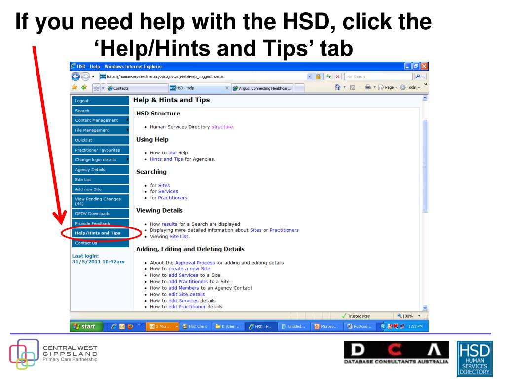 HSD Contact Details Content Manager: Justin Fisher or the Help Desk Staff (03) 9320 9070 hsd.admin@data.com.au Database Consultants Australia