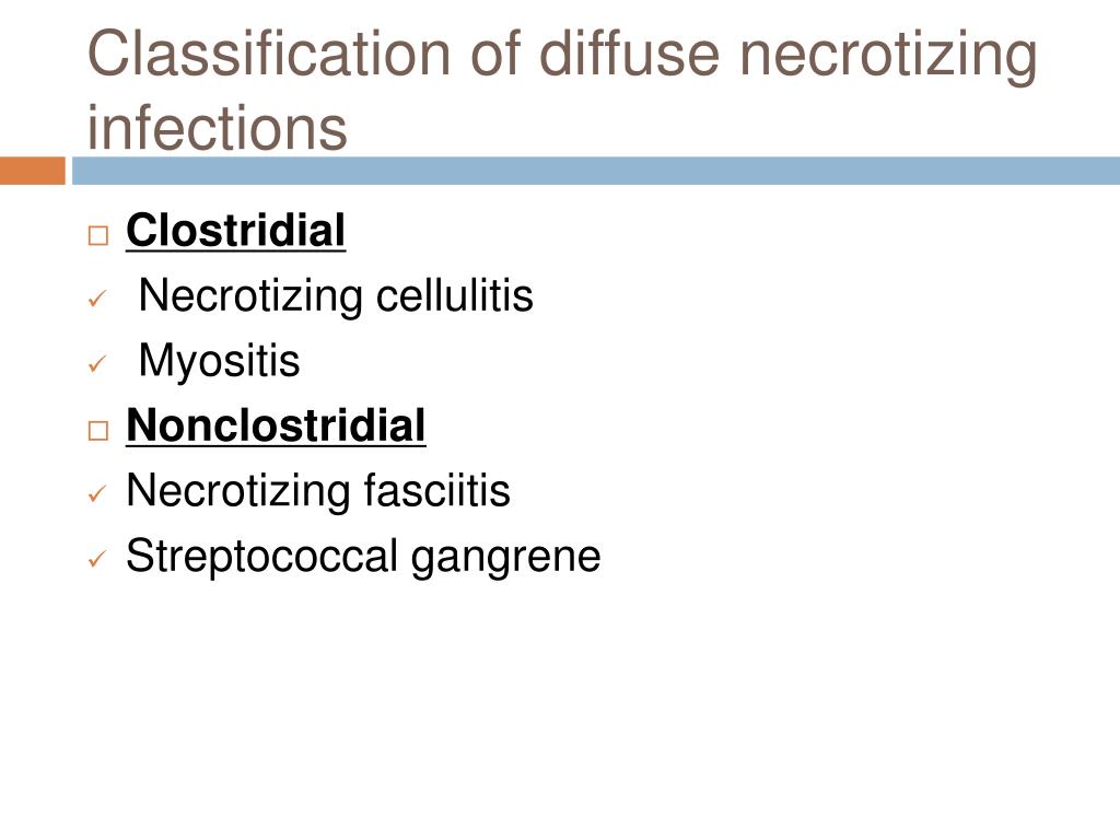 Classification of diffuse necrotizing infections • Clostridial • Necrotizing cellulitis • Myositis • Nonclostridial • Necrotizing fasciitis • Streptococcal gangrene