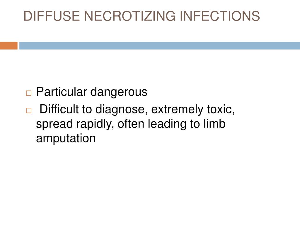 DIFFUSE NECROTIZING INFECTIONS • Particular dangerous • Difficult to diagnose, extremely toxic, spread rapidly, often leading to limb amputation