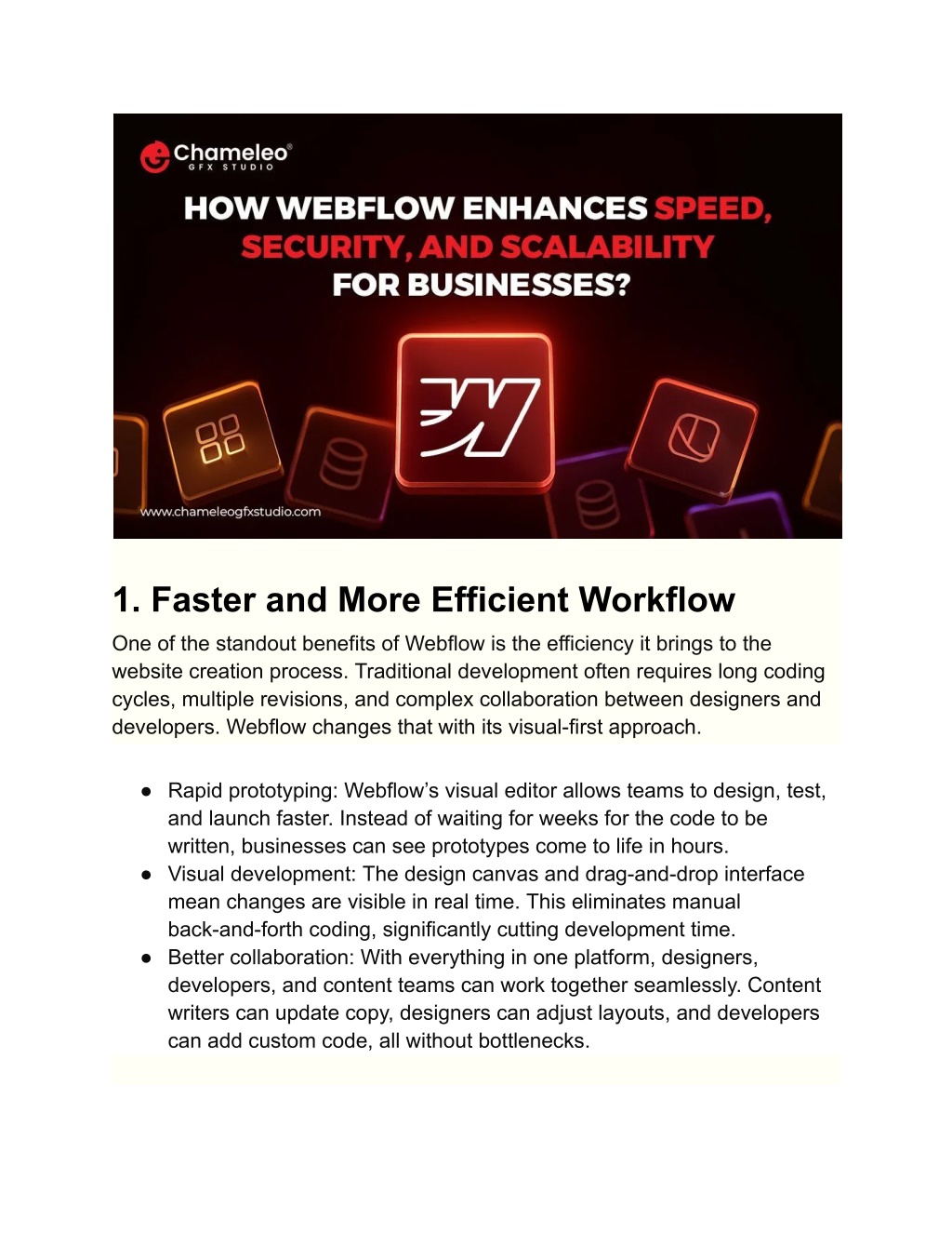 ● High-speed performance that keeps users engaged. ● Enterprise-Level Security without added complexity. ● Seamless Scalability for long-term growth. ● Custom Development Flexibility for unique features. ● Modern Website Design Tools that blend creativity and functionality. ● Built-In SEO Features that support higher rankings. Final Thoughts : Your business website should be an asset that drives growth, not a burden that slows you down. Webflow is designed to deliver speed, security, and scalability while giving businesses the freedom to create, customize, and innovate. If you are exploring Webflow development services in Ahmedabad, or anywhere across India, the right agency can help you unlock Webflow’s full potential from custom development and SEO-friendly design to seamless maintenance and integrations. At Chameleo GFX Studio, we specialize in delivering tailored Webflow solutions that empower businesses to upgrade their digital presence. For those ready to grow, Webflow isn’t just a website builder; it’s a complete digital solution.