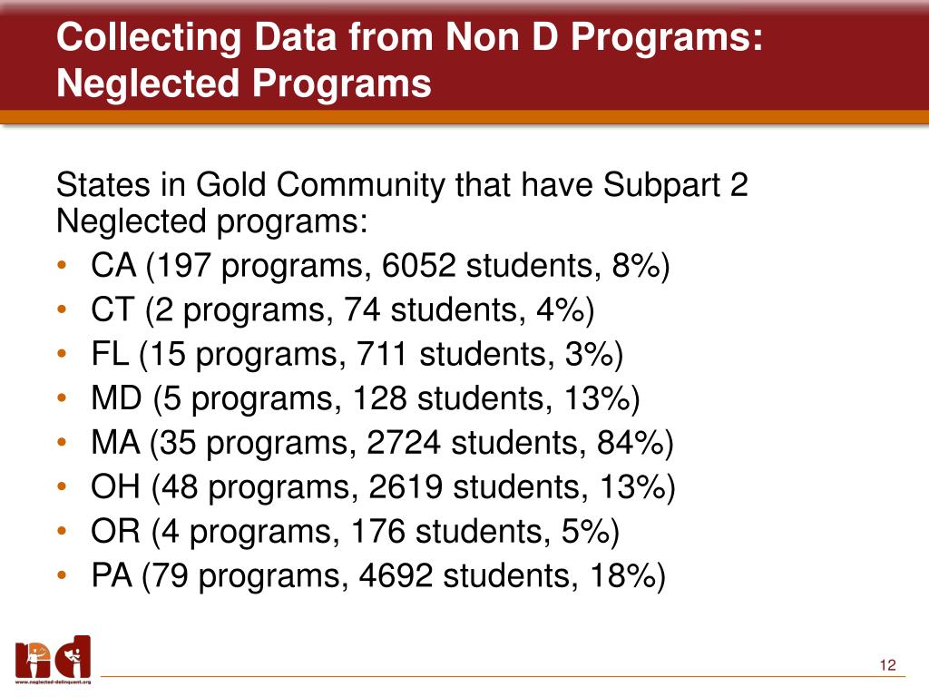 Collecting Data from Non D Programs: Neglected Programs States in Gold Community that have Subpart 2 Neglected programs: • CA (197 programs, 6052 students, 8%) • CT (2 programs, 74 students, 4%) • FL (15 programs, 711 students, 3%) • MD (5 programs, 128 students, 13%) • MA (35 programs, 2724 students, 84%) • OH (48 programs, 2619 students, 13%) • OR (4 programs, 176 students, 5%) • PA (79 programs, 4692 students, 18%)