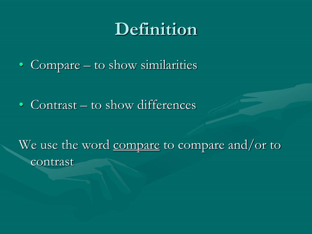 Definition • Compare – to show similarities • Contrast – to show differences We use the word compare to compare and/or to contrast