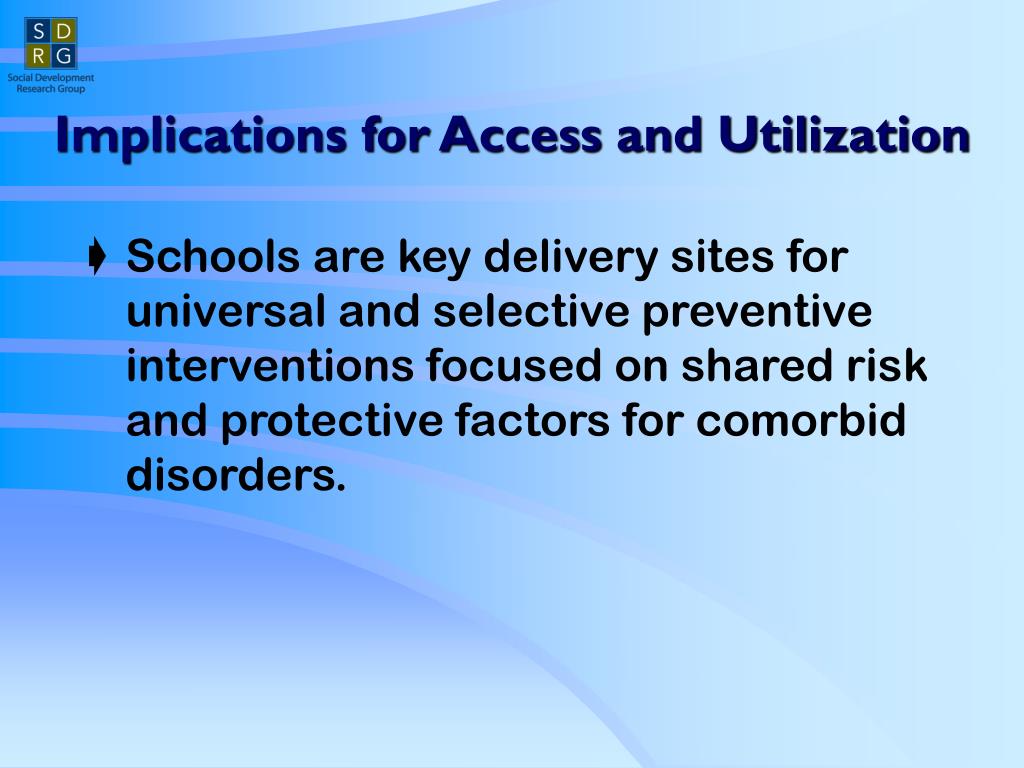 Implications for Access and Utilization • Schools are key delivery sites for universal and selective preventive interventions focused on shared risk and protective factors for comorbid disorders.