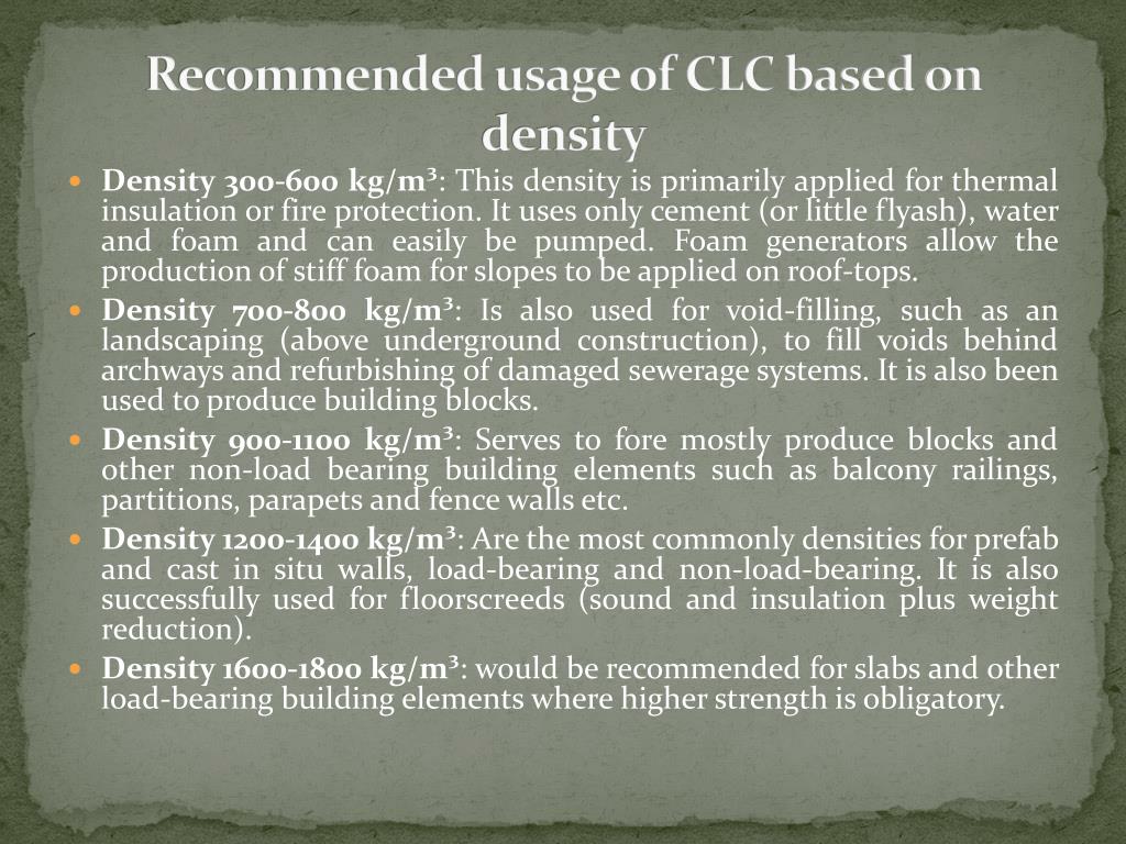 Recommended usage of CLC based on density • Density 300-600 kg/m³: This density is primarily applied for thermal insulation or fire protection. It uses only cement (or little flyash), water and foam and can easily be pumped. Foam generators allow the production of stiff foam for slopes to be applied on roof-tops. • Density 700-800 kg/m³: Is also used for void-filling, such as an landscaping (above underground construction), to fill voids behind archways and refurbishing of damaged sewerage systems. It is also been used to produce building blocks. • Density 900-1100 kg/m³: Serves to fore mostly produce blocks and other non-load bearing building elements such as balcony railings, partitions, parapets and fence walls etc. • Density 1200-1400 kg/m³: Are the most commonly densities for prefab and cast in situ walls, load-bearing and non-load-bearing. It is also successfully used for floorscreeds (sound and insulation plus weight reduction). • Density 1600-1800 kg/m³: would be recommended for slabs and other load-bearing building elements where higher strength is obligatory.