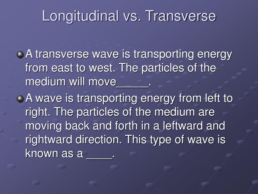 Longitudinal vs. Transverse • A transverse wave is transporting energy from east to west. The particles of the medium will move_____. • A wave is transporting energy from left to right. The particles of the medium are moving back and forth in a leftward and rightward direction. This type of wave is known as a ____.