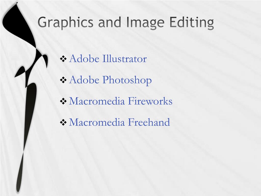 Graphics and Image Editing • Adobe Illustrator • Adobe Photoshop • Macromedia Fireworks • Macromedia Freehand