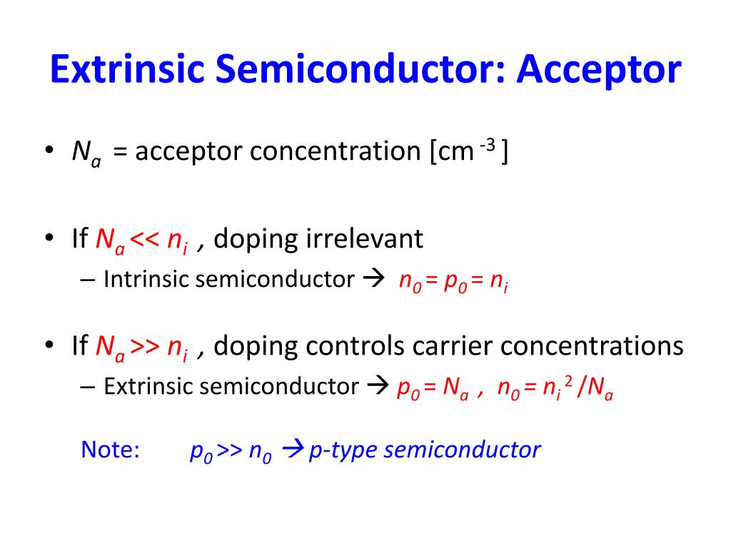 Extrinsic Semiconductor: Acceptor • Na = acceptor concentration [cm -3 ] • IfNa << ni, doping irrelevant • Intrinsic semiconductor n0= p0 = ni • IfNa >> ni, doping controls carrier concentrations • Extrinsic semiconductor p0= Na , n0 = ni2 /Na Note: p0 >> n0 p-type semiconductor