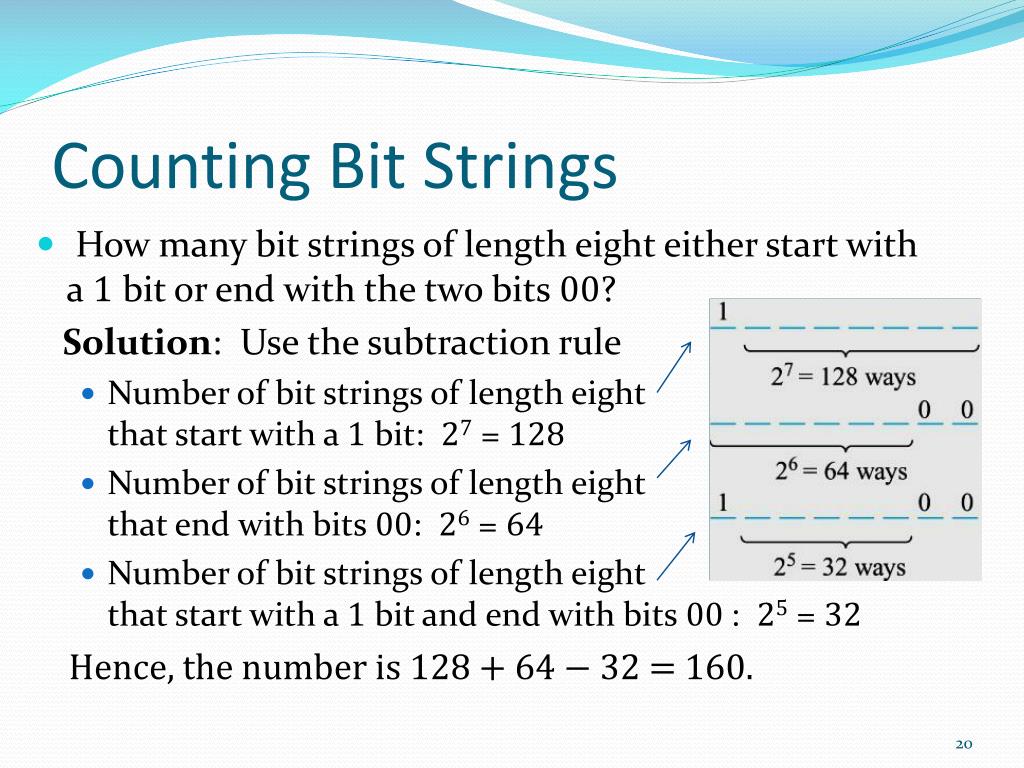 Counting Bit Strings • How many bit strings of length eight either start with a 1 bit or end with the two bits 00? Solution: Use the subtraction rule • Number of bit strings of length eight that start with a 1 bit: 27 = 128 • Number of bit strings of length eight that end with bits 00: 26 = 64 • Number of bit strings of length eight that start with a 1 bit and end with bits 00 : 25 = 32 Hence, the number is 128 + 64 − 32 = 160.