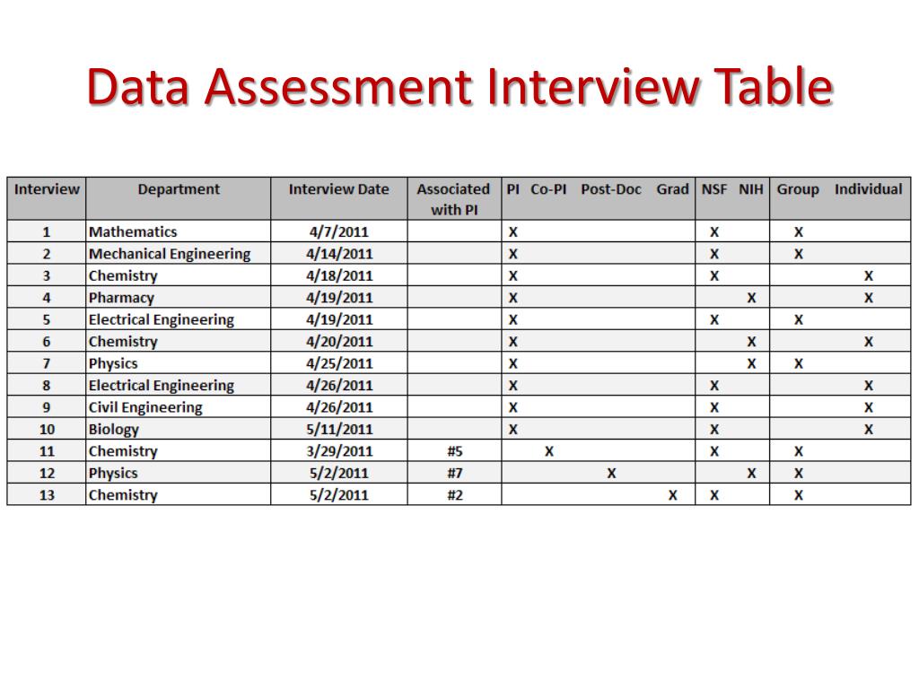 Campus-wide Data Management Assessment A Pilot Study Who did we interview? • Targeted: PIs of 9 NSF & 5 NIH funded projects • Completed Interviews: PIs of 7 NSF & 3 NIH projects • Additional Interviews:1 Co-PI, 1 Post-Doc, 1 RA