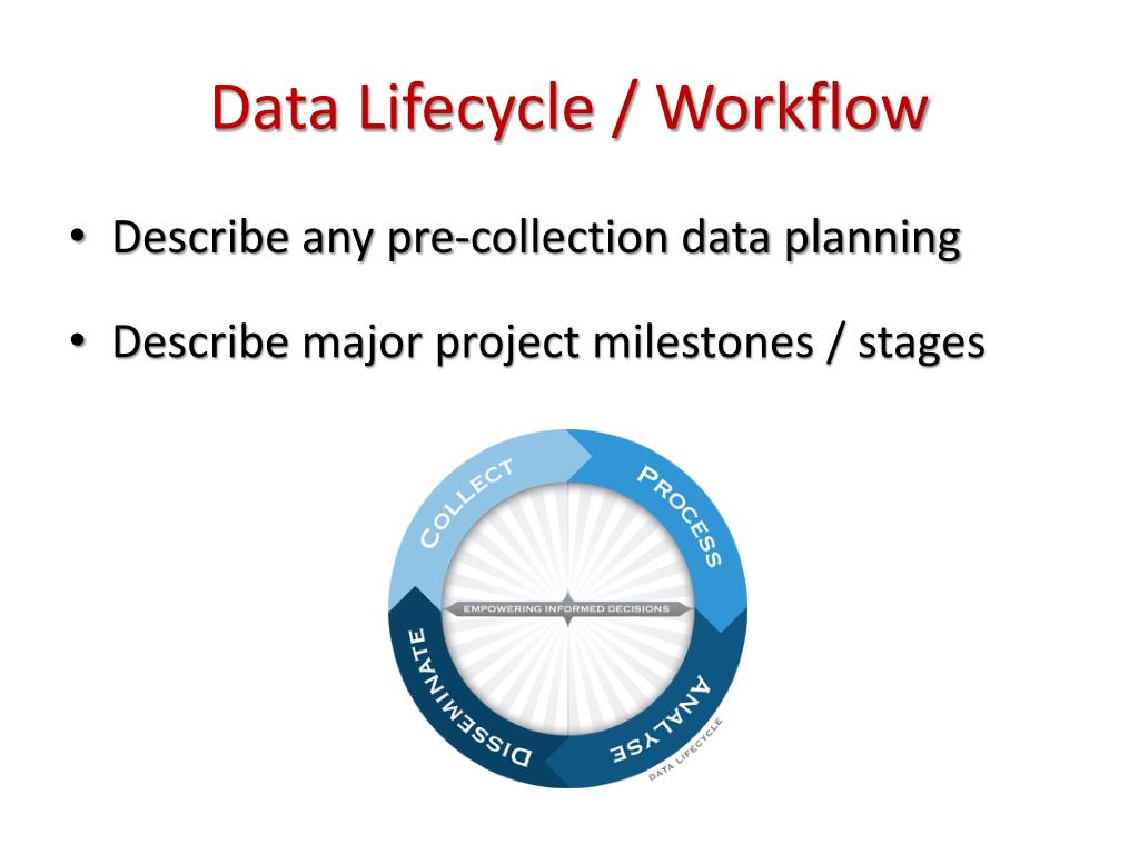 Data Lifecycle / Workflow • Describe any pre-collection data planning • Describe major project milestones / stages