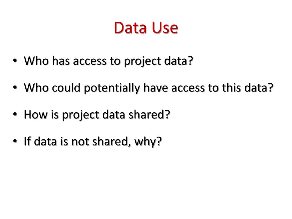 Data Use • Who has access to project data? • Who could potentially have access to this data? • How is project data shared? • If data is not shared, why?