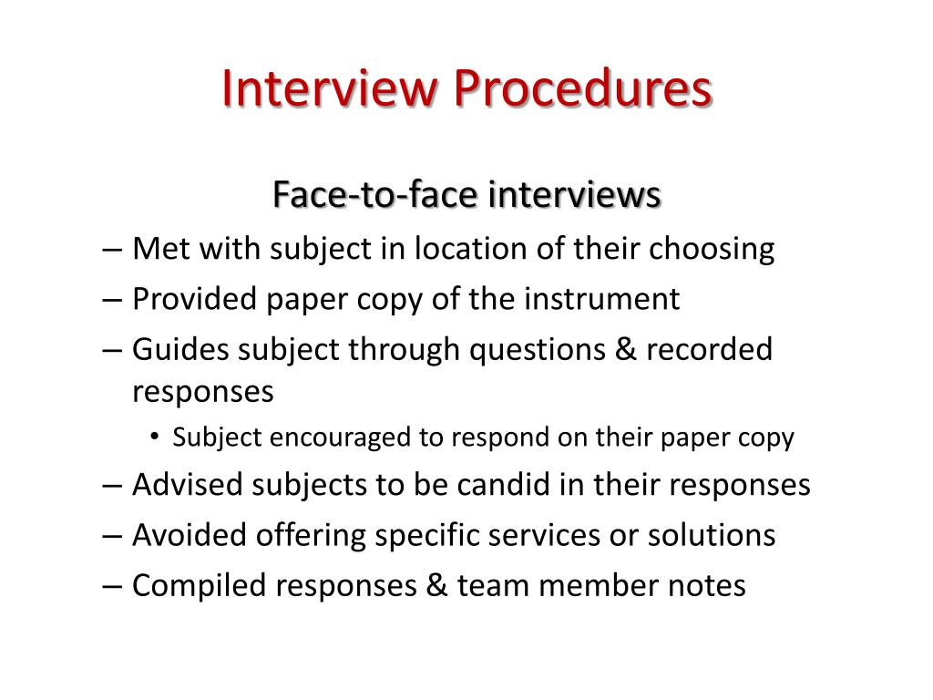 Interview Procedures Face-to-face interviews • Met with subject in location of their choosing • Provided paper copy of the instrument • Guides subject through questions & recorded responses • Subject encouraged to respond on their paper copy • Advised subjects to be candid in their responses • Avoided offering specific services or solutions • Compiled responses & team member notes
