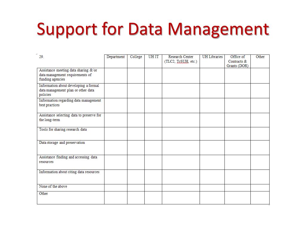 Preliminary Findings • UH Campus Researchers are not currently looking for server space or data storage • What they do need… • Assistance with funding agency DMP requirements • Grant proposal process • Finding data-related services on campus • Publication Support • Targeted research assistance attendant to data management