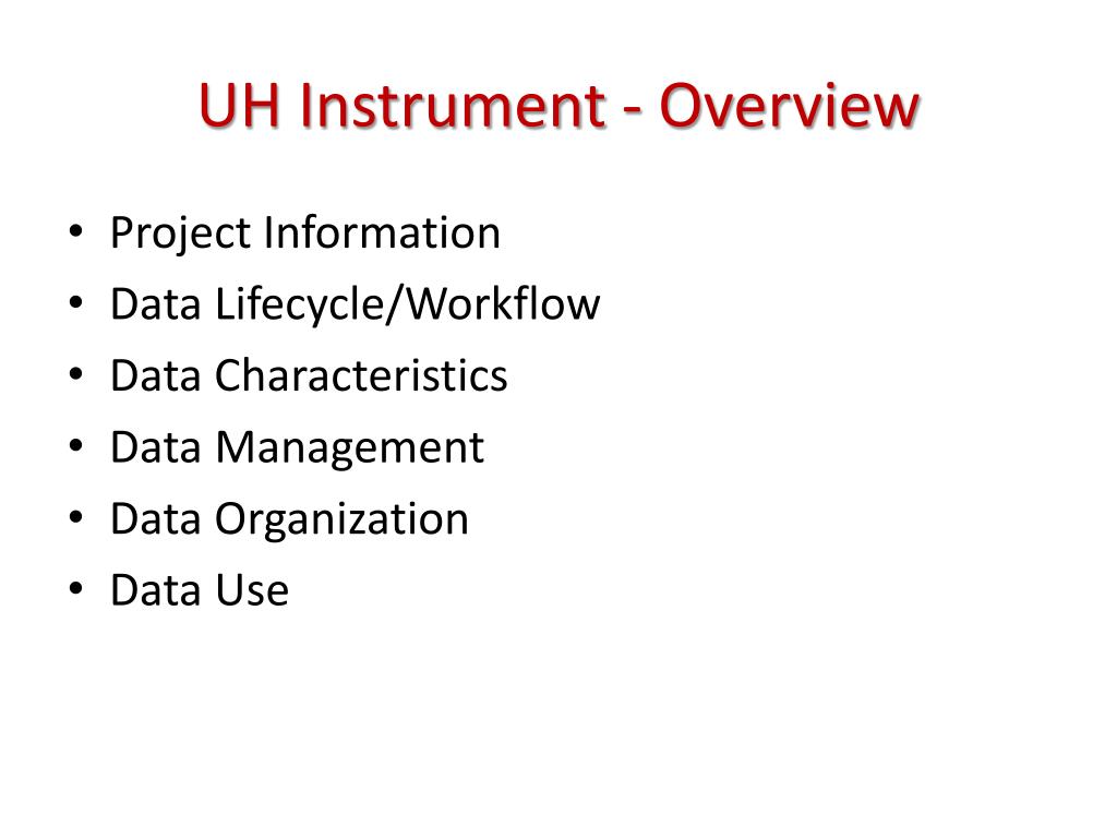 UH Instrument - Overview • Project Information • Data Lifecycle/Workflow • Data Characteristics • Data Management • Data Organization • Data Use