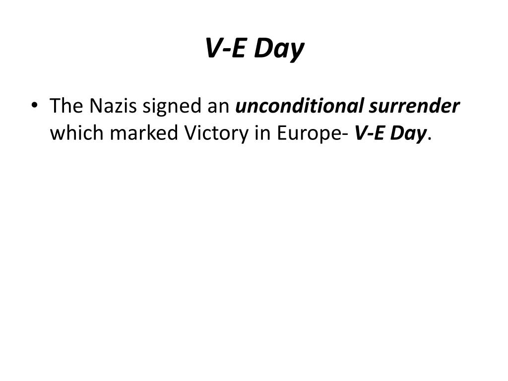 V-E Day • The Nazis signed an unconditional surrender which marked Victory in Europe- V-E Day.
