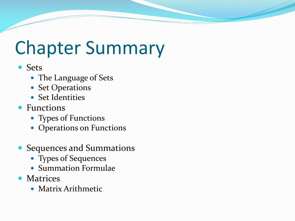 Chapter Summary • Sets • The Language of Sets • Set Operations • Set Identities • Functions • Types of Functions • Operations on Functions • Sequences and Summations • Types of Sequences • Summation Formulae • Matrices • Matrix Arithmetic
