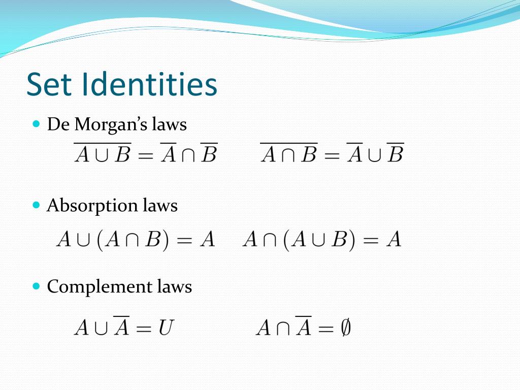 Set Identities • De Morgan’s laws • Absorption laws • Complement laws